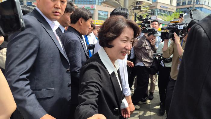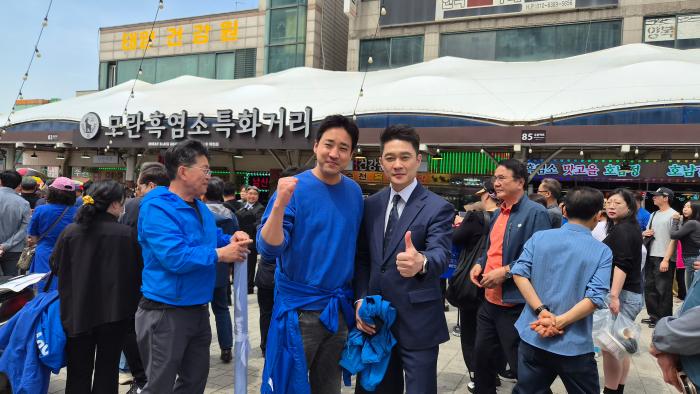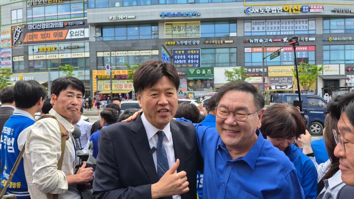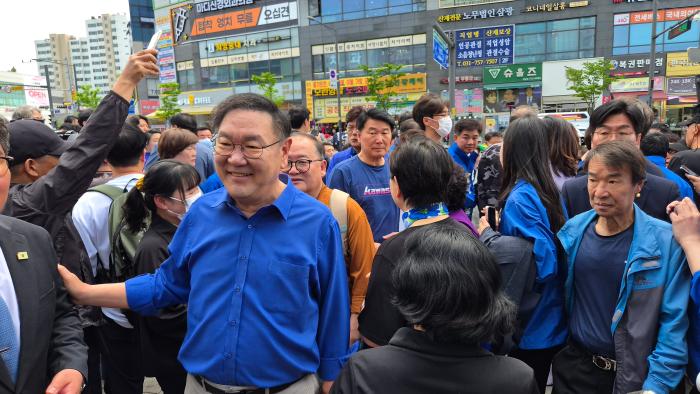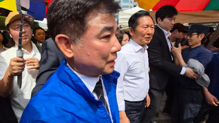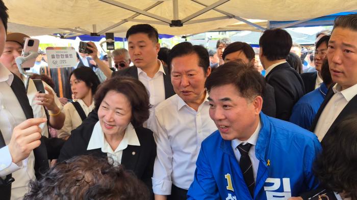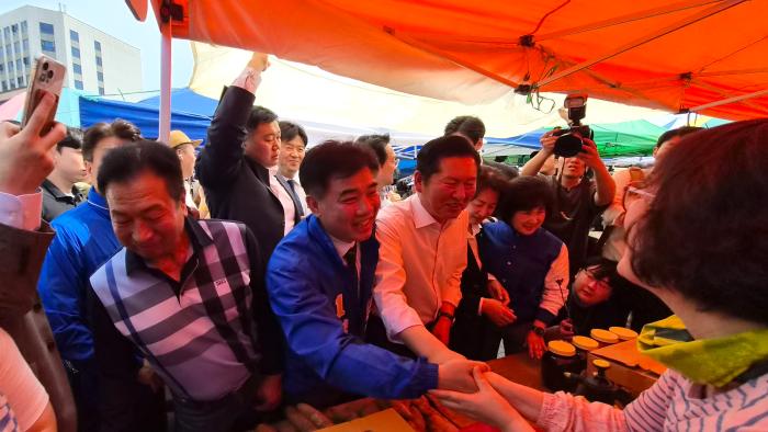 ▲정청래 민주당대표,추미애 경기도지사후보,김병욱 성남시장후보가 모란오일장 민생청취를 위해 듣고있다  -김금호기자-